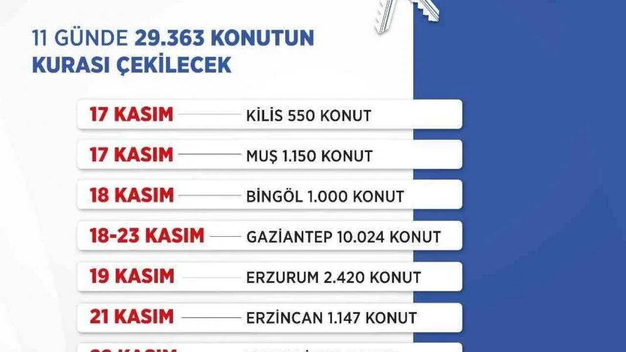 7-16 Kasım’da arasında Şırnak, Ardahan, Kars, Siirt, Iğdır, Batman, Ağrı, Mardin, Van, Şanlıurfa, Hakkari, Bitlis’te noter huzurunda gerçekleştirilen kura çekiminde 21 bin 893 konutun hak sahibi belli oldu.