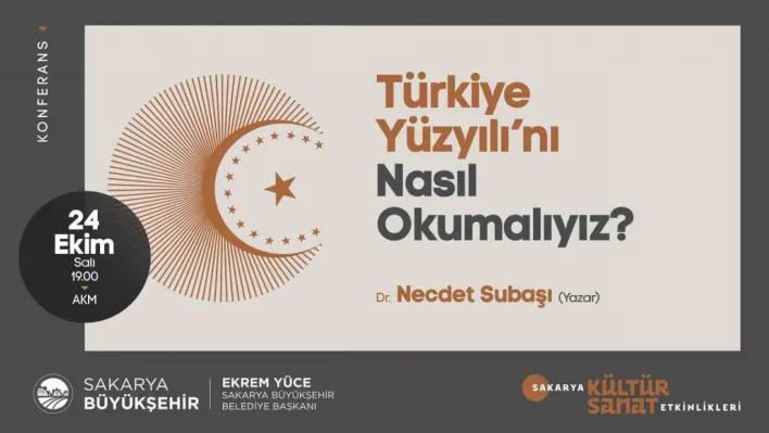 Sakarya Büyükşehir Belediyesi Ekim kültür sanat etkinlikleri 'Türkiye Yüzyılı'nı Nasıl Okumalıyız?' konferansıyla devam edecek. Yazar Dr. Necdet Subaşı'nın konuşmacı olarak katılacağı program 24 Ekim Salı günü saat 19.00'da AKM'de gerçekleştirilecek.
