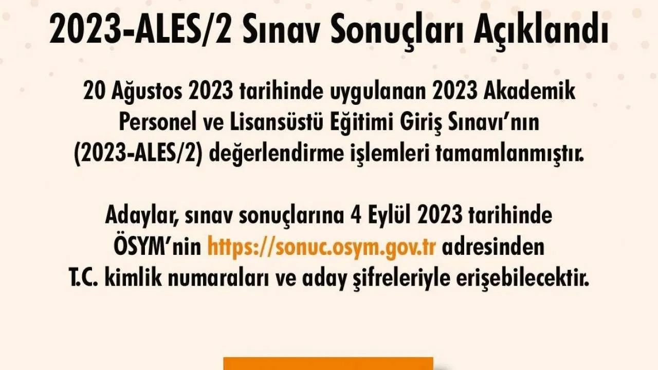 Ölçme, Seçme ve Yerleştirme Merkezi (ÖSYM) Başkanlığı tarafından 2023-ALES/2 sonuçları açıklandı.