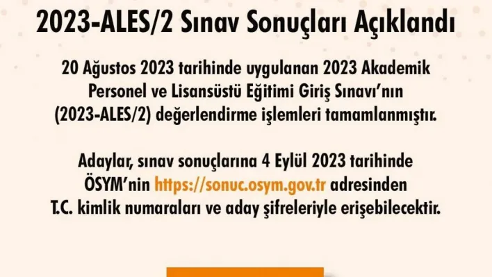 ÖSYM tarafından 20 Ağustos 2023 tarihinde uygulanan 2023 Akademik Personel ve Lisansüstü Eğitimi Giriş Sınavı (2023-ALES/2) sonuçları açıklandı. Adaylar, sınav sonuçlarına ÖSYM’nin https://sonuc.osym.gov.tr adresinden T.C. kimlik numaraları ve aday şifreleri ile erişebilecek.