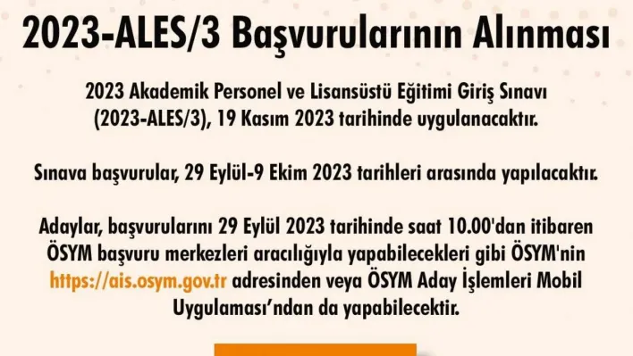 ÖSYM’den yapılan açıklamaya göre, 2023-ALES/3 başvuruları başladı. Başvurular, 29 Eylül-9 Ekim tarihleri arasında yapılacak. Adaylar, başvurularını ÖSYM başvuru merkezleri ve ÖSYM’nin https://ais.osym.gov.tr adresinden yapabilecek. 2023-ALES/3, 19 Kasım tarihinde gerçekleştirilecek.