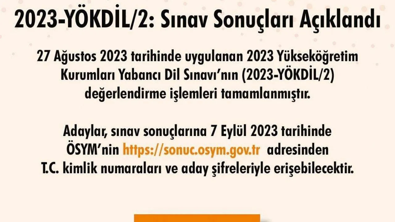 Ölçme, Seçme ve Yerleştirme Merkezi (ÖSYM) Başkanlığı tarafından 2023-YÖKDİL/2 sonuçları açıklandı.