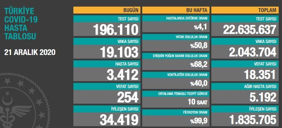 Sağlık Bakanlığı son 24 saatte 254 kişinin korona virüsten hayatını kaybettiğini, 19 bin 103 yeni vaka sayısının olduğunu açıkladı.