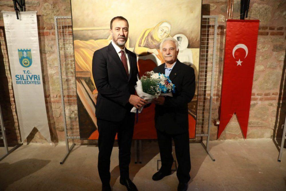 Silivri Belediye Başkanı Volkan Yılmaz, Silivri Belediyesi Kültür Merkezi Resim Eğitmeni Niyazi Evrensel’e tüm eser sahiplerini temsilen çiçek hediye etti.