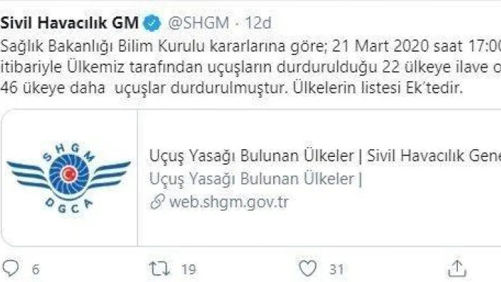 Sivil Havacılık Genel Müdürlüğü’nün (SHGM) resmi sosyal medya hesabı Twitter’dan yapılan paylaşımda, “Sağlık Bakanlığı Bilim Kurulu kararlarına göre, 21 Mart 2020 saat 17.00 itibariyle ülkemiz tarafından uçuşların durdurulduğu 22 ülkeye ilave olarak 46 ülkeye daha uçuşlar durdurulmuştur” ifadelerine yer verildi.