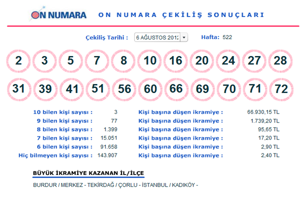 Şanslı numaralar 2, 3, 5, 7, 8, 10, 16, 20, 24, 27, 28, 31, 39, 41, 51, 56, 60, 66, 69, 70, 71 ve 72 olarak belirlendi.