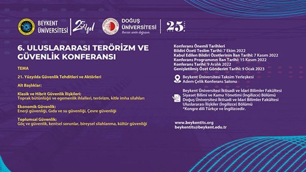 21. Yüzyılda Güvenlik Tehditleri ve Aktörleri temasıyla düzenlenen 6. Uluslararası Terörizm ve Güvenlik Konferansı, Beykent Üniversitesi Taksim yerleşkesinde 9 Aralık 2022 tarihinde başlıyor. “Birey, toplum ve devlet nezdinde yerelden küresele güvenlik ihtiyaçları her geçen gün çeşitlenmektedir” diye başlayan konferansın çağrı metni şu şekilde devam ediyor: “Güvenlik ihtiyacıyla beraber aktörlerin ve politikaların dönüşümü ortaya çıkmaktadır. Dönüşümün çerçevesi, fırsatları ve tehditleri içerecek şekilde genişlemektedir. 9 Aralık 2022 tarihinde gerçekleştirilecek olan 6. Uluslararası Terörizm ve Güvenlik Konferansı’yla güvenliğin farklı boyutlarına ve ihtiyaçlarına odaklanılacaktır.”