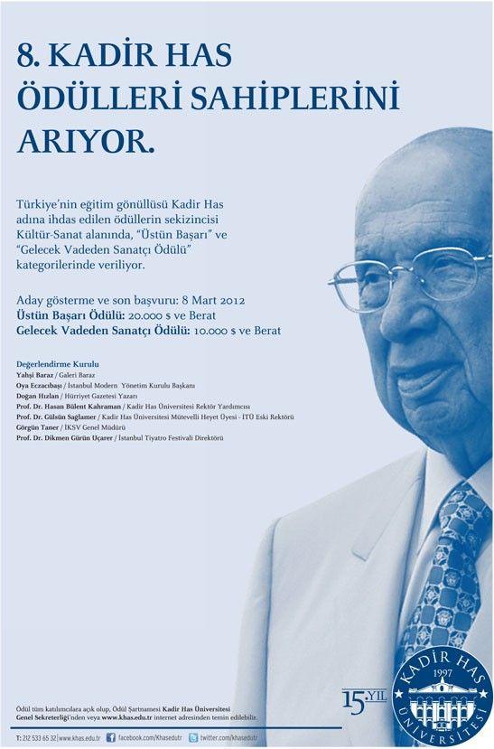 Kadir Has Üniversitesi'nin kurucusu Türkiye'nin öncü hayırseverlerinden merhum Kadir Has adına 7 yıldır verilen başarı ödülleri, bu yıl kültür-sanat alanında 'Sanatta Üstün Başarı Ödülü' ve 'Gelecek Vadeden Sanatçı Ödülü' olarak iki kategoride veriliyor