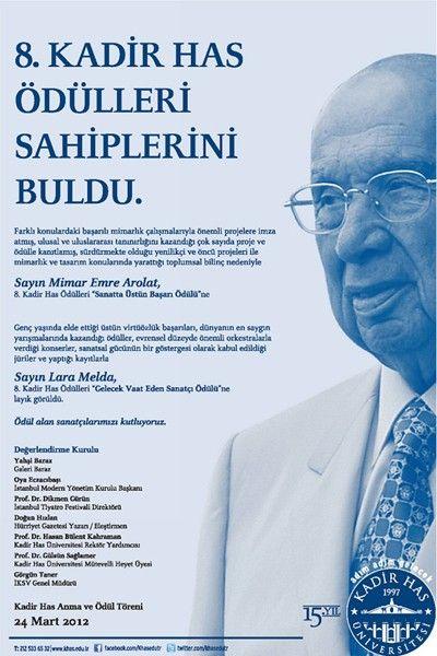 Kadir Has Üniversitesi'nin kurucusu Türkiye'nin öncü hayırseverlerinden merhum Kadir Has adına 7 yıldır verilen başarı ödülleri, bu yıl kültür-sanat alanında 'Sanatta Üstün Başarı Ödülü' ve 'Gelecek Vadeden Sanatçı Ödülü' olarak iki kategoride verildi.