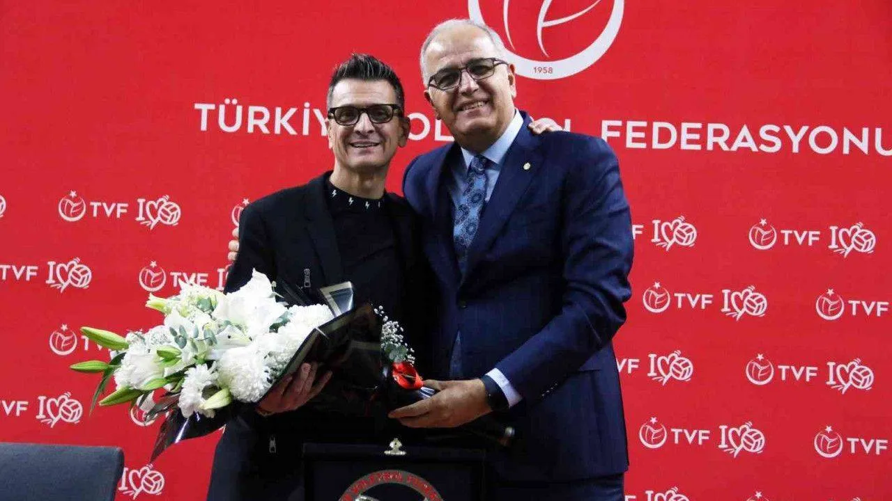 TVF Başkanı Mehmet Akif Üstündağ konuşmalar sonrasında Başantrenör Giovanni Guidetti’ye plaket ve çiçek takdim etti.
