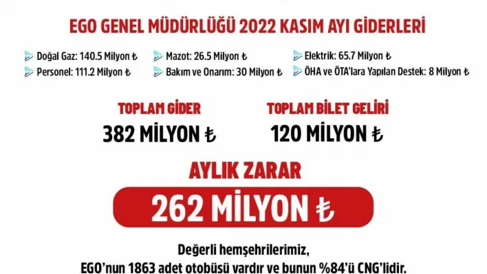 Doğrultusunda EGO Genel Müdürlüğünün 2022 yılı Kasım ayı toplam gideri 382 milyon lira olduğu, toplam bilet gelirinin ise 120 milyon lira olduğu bu bundan dolayı da aylık zararın 262 milyon lira olduğu açıklandı.