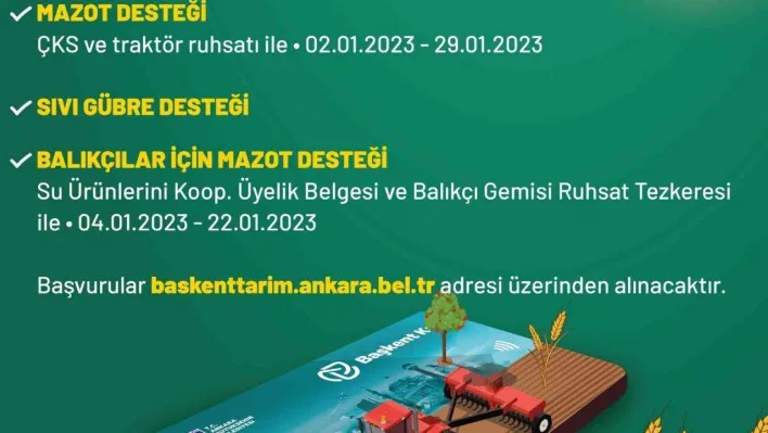 Yerli üretime teşvik etmek amacıyla ‘baskenttarim.ankara.bel.tr’ internet sitesi üzerinden devam eden mazot desteği başvuruları, Çiftçi Kayıt Belgesi (ÇKS) ve traktör ruhsatı olan çiftçiler için 29 Ocak, Su Ürünleri Kooperatiflerine üyelik belgesi ve balıkçı gemisi ruhsat tezkeresi olan balıkçılar için ise 22 Ocak tarihine kadar devam edecek.