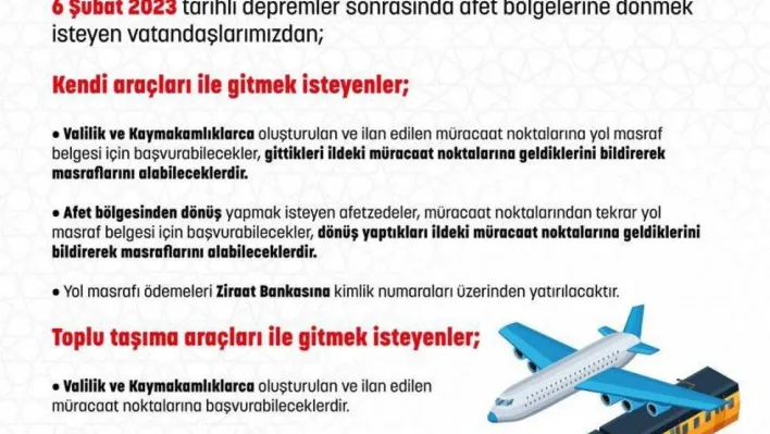 Toplu taşıma araçları ile gitmek isteyen vatandaşlar ise, Valilik ve Kaymakamlıklarca oluşturulacak ve ilan edilecek müracaat noktalarına başvurabilecekler. Valilik veya Kaymakamlık tarafından temin edilen uygun araçlar ile (Otobüs, minibüs, havayolu, demiryolu vb.) afet bölgelerine ulaşımları sağlanacak. Kendisi bilet alan depremzedeler ise müracaat noktalarına başvurmaları halinde bilet ücretleri Ziraat Bankasına kimlik numaraları üzerinden yatırılacak.