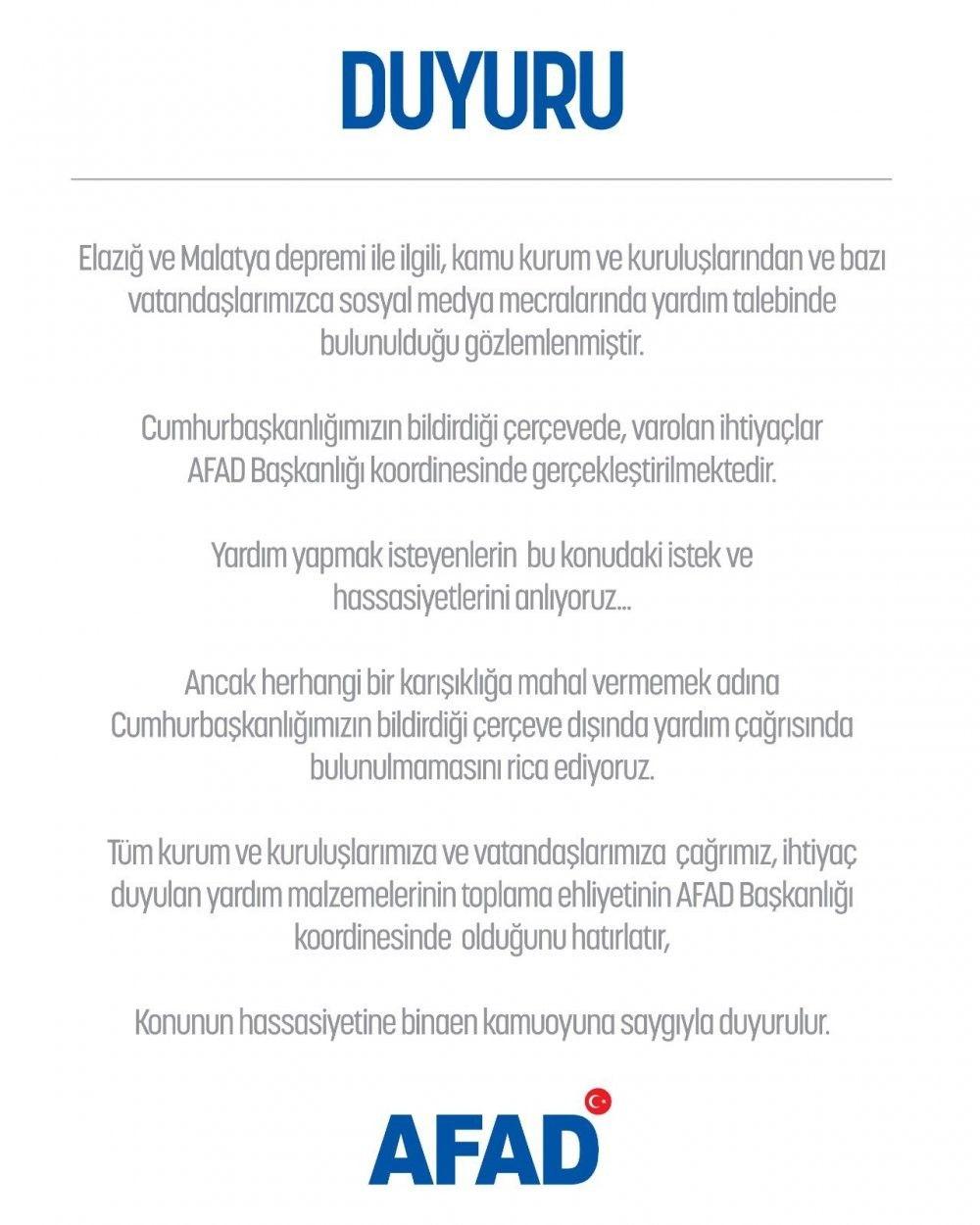 Yardım yapmak isteyenlerin bu konudaki istek ve hassasiyetlerini anlıyoruz. Ancak herhangi bir karışıklığa mahal vermemek adına Cumhurbaşkanlığımızın bildirdiği çerçeve dışında yardım çağrısında bulunmamasını rica ediyoruz. Tüm kurum ve kuruluşlarımıza ve vatandaşlarımıza çağrımız, ihtiyaç duyulan yardım malzemelerinin toplama ehliyetinin AFAD Başkanlığı koordinesinde olduğunu hatırlatır, Konunun hassasiyetine binaen kamuoyuna saygıyla duyurulur."