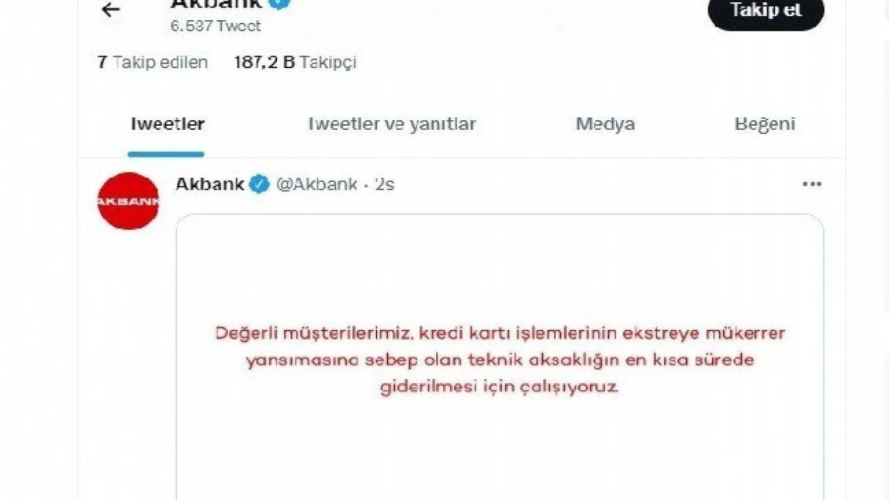 Akbank kullanıcıları mobil ve internet bankacılığı açtıklarından taksitlerinin iki kez çekildiğini fark etti. Konu sosyal medyada gündeme gelince banka sosyal medya hesabından şu açıklamaya yer verdi: "Değerli müşterilerimiz, kredi kartı işlemlerinin ekstreye mükerrer yansımasına sebep olan teknik aksaklığın ek kısa sürede giderilmesi için çalışıyoruz".