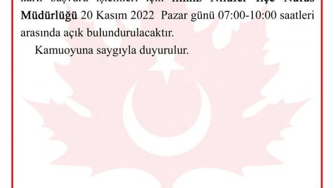 "2022 Akademik Personel ve Lisansüstü Eğitimi Giriş Sınavına (2022-ALES/3) katılacak adayların, T.C. kimlik kartı başvuru işlemleri için ilimiz Nilüfer İlçe Nüfus Müdürlüğü 20 Kasım 2022 Pazar günü 07.00-10.00 saatleri arasında açık bulundurulacaktır."