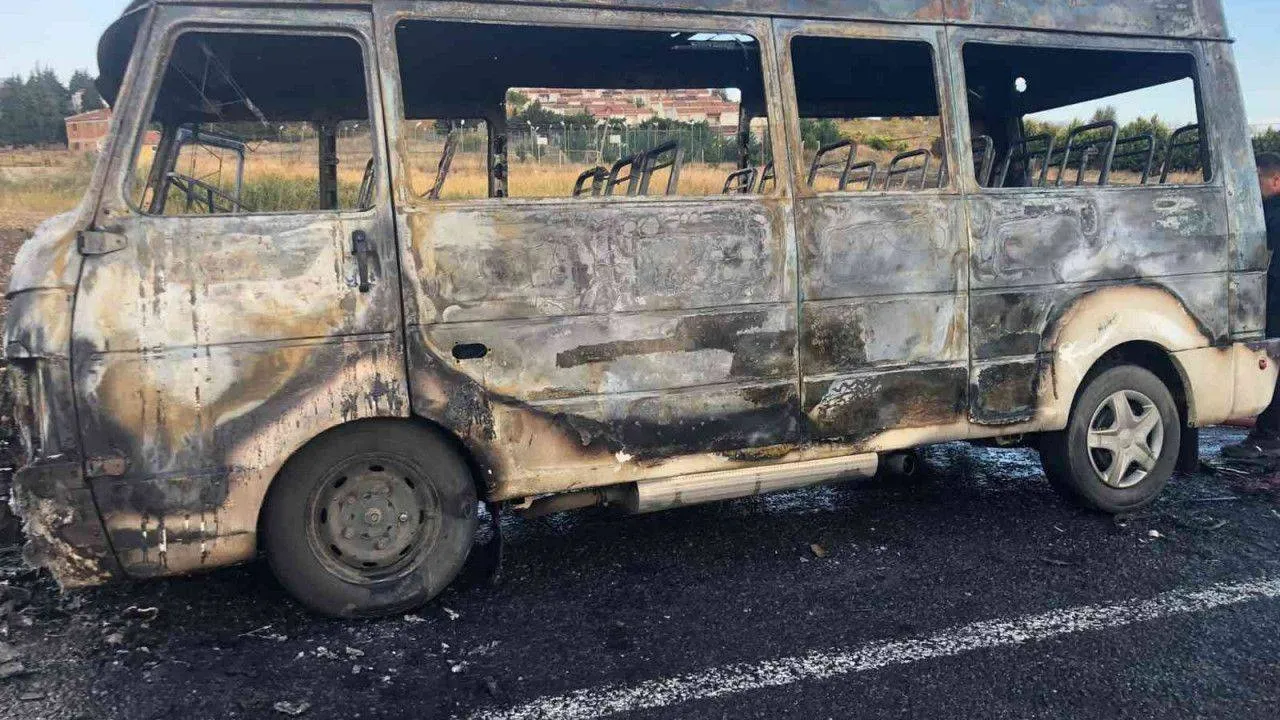 Tekirdağ’ın Şarköy ilçesinde seyir halindeyken alev alan öğrenci servisinden geriye demir yığını kaldı.