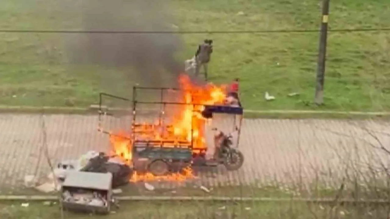 Kocaeli’nin Kartepe ilçesinde bir kağıt toplayıcısı, ekmek teknesi motosikletinin alev alev yanışını çaresiz gözlerle izledi. O anlar cep telefonu kamerasıyla saniye saniye kaydedildi.