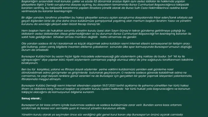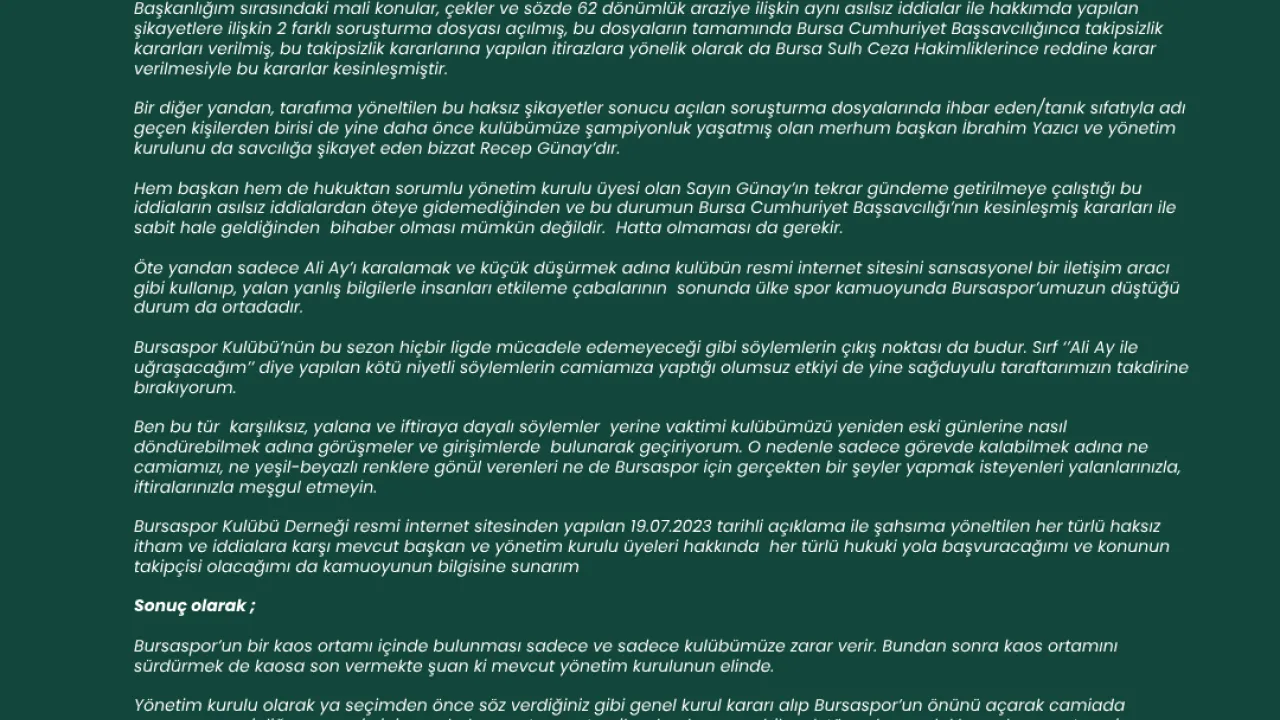 "19.07.2023 Çarşamba günü Bursaspor Kulübü Derneği resmi internet sitesi aracılığıyla Bursaspor Yönetim Kurulu tarafından yapılan açıklama ile şahsım hakkında asılsız ve haksız iddialar gündeme getirilmiştir. Öncelikle, böylesi mesnetsiz iddiaların, tam da Bursaspor Kulübü’nün yapılacak ilk genel kurulunda başka bir adayın çıkmaması halinde başkanlığa aday olacağımı açıklamış olmam akabinde gündeme getirilmiş olmasını kamuoyunun takdirine bırakmaktayım. Başkanlığım sırasındaki mali konular, çekler ve sözde 62 dönümlük araziye ilişkin aynı asılsız iddialar ile hakkımda yapılan şikayetlere ilişkin 2 farklı soruşturma dosyası açılmış, bu dosyaların tamamında Bursa Cumhuriyet Başsavcılığınca takipsizlik kararları verilmiş, bu takipsizlik kararlarına yapılan itirazlara yönelik olarak da Bursa Sulh Ceza Hakimliklerince reddine karar verilmesiyle bu kararlar kesinleşmiştir.
