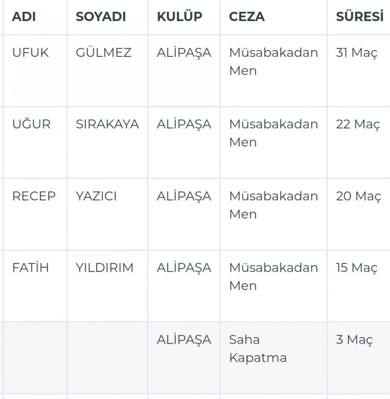 TFF İstanbul 2. Amatör Kümede mücadele den Alipaşaspor'da yaşanan talihsiz olayın ardından federasyonca verilen ligden ihraç cezası yapılan itirazlar ve verilen ifadelerin ardından olaylara karışan oyuncular ceza aldı.