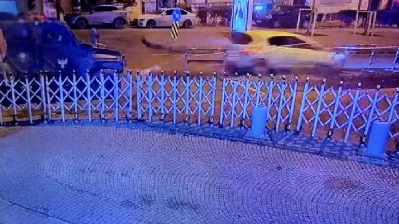 Sesleri duyan koruma polisleri teyakkuza geçerek dışarıya çıktı. Aracın kaçtığını gören polis ekipleri, ön plakasını da düşürdüğünü belirledi. Bunun üzerine bilgi veren koruma polislerinin ihbarı üzerine bölgedeki tüm ekiplere aracın plakası anons edildi. Yaşananlar güvenlik kameralarına saniye saniye yansıdı. Görüntülerde, sürücü aracıyla demir bariyerleri devirerek kaçıyor.