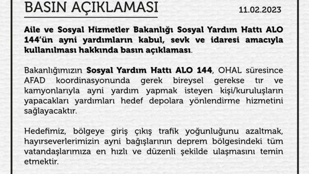 Aile ve Sosyal Hizmetler Bakanlığından yapılan açıklamada, ”Bakanlığımızın Sosyal Yardım Hattı ALO 144, OHAL süresince AFAD koordinasyonunda gerek bireysel gerekse tır ve kamyonlarıyla ayni yardım yapmak isteyen kişi ve kuruluşların yapacakları yardımları hedef depolara yönlendirme hizmetini sağlayacaktır. Hedefimiz, bölgeye giriş çıkış trafik yoğunluğunu azaltmak, hayırseverlerimizin ayni bağışlarının deprem bölgesindeki tüm vatandaşlarımıza en hızlı ve düzenli şekilde ulaşmasını temin etmektir” ifadeleri kullanıldı.