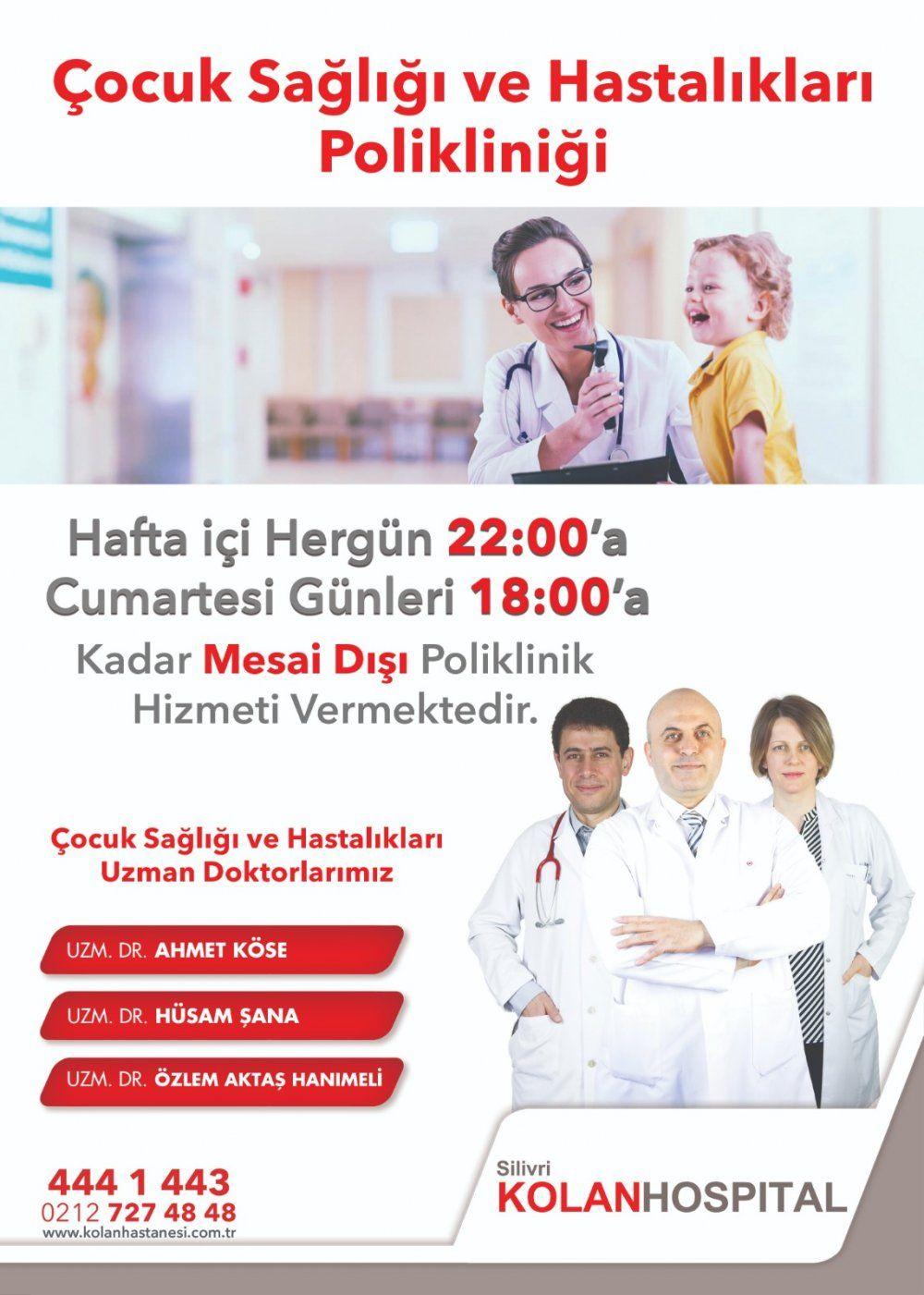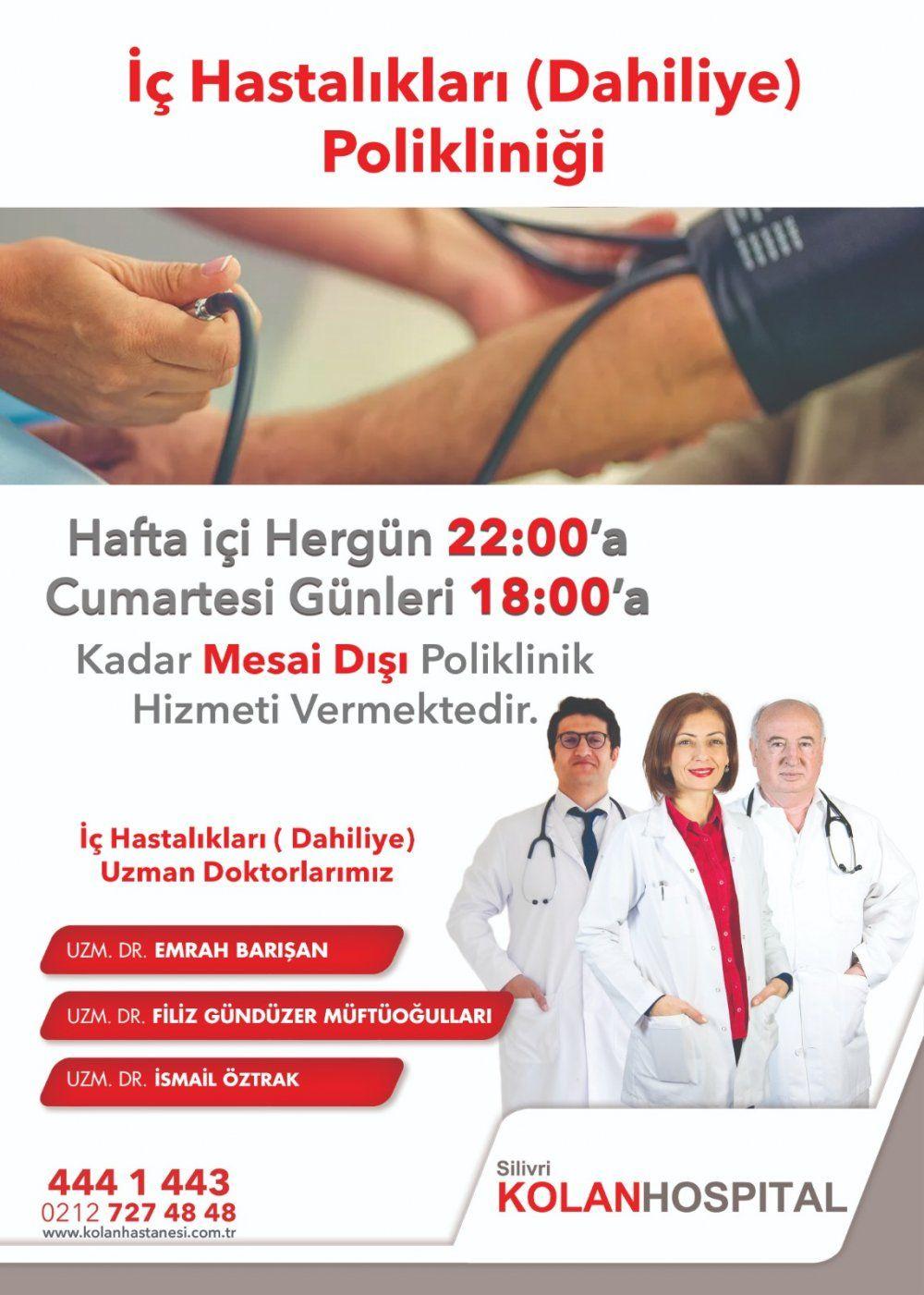 Özel Silivri Kolan Hastanesi’nde geçtiğimiz günlerde başlatılan uygulama Çocuk Sağlığı ve Hastalıkları branşında Uzm Dr. Ahmet Köse, Uzman Dr.Hüsam Şana ve Uzm.Dr.Özlem Aktaş Hanımeli,İç hastalıkları (Dahiliye) branşında da Uzm.Dr.Emrah Barışan,Uzm.Dr.Filiz Gündüzer Müftüoğulları ve Uzm.Dr.İsmail Öztrak mesai dışında hasta kabul etmeye başladı.