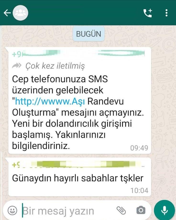 Korona virüs aşısını bile kötü emelleri için kullanan dolandırıcılar vatandaşları bu sefer de SMS atarak tuzağa düşürmeye çalışırken, vatandaşlar da sosyal medya hesaplarından birbirlerine uyarılarda bulunmaya devam ediyor. Sosyal medya üzerinde özellikle 65 yaş üstü vatandaşların dikkat edilmesi konusunda yapılan uyarılarda "Cep telefonunuza SMS üzerinden gelebilecek 'http://wwww.Aşı Randevu Oluşturma' mesajını birlikte gelen linki açmayınız. Yeni bir dolandırıcılık girişimi başlamış. Yakınlarınızı bilgilendiriniz" ifadelerine yer veriliyor.