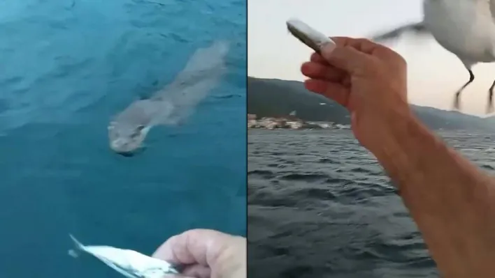 Yalova'da açıldığı denizde teknesine çıkan su samurunu tuttuğu balıklarla elleriyle besleyen amatör balıkçı Sinan Karagöz, bu kez martılara balık ziyafeti sundu.