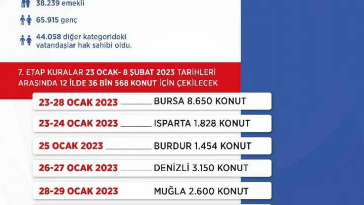 7'nci etap kuraları da 12 ilde 8 Şubat 2023'e kadar devam edecek. 12 ilde gerçekleştirilecek 36 bin 568 hak sahibi için illere göre dağılım ve kura tarihleri ise şu şekilde açıklandı: