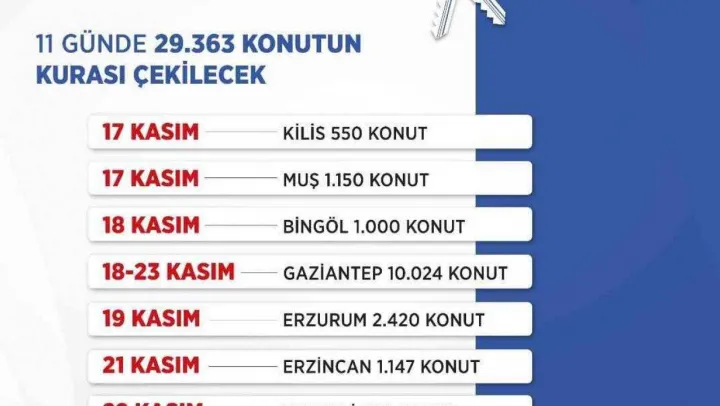 Bugün itibariyle Kilis ve Muş'tan başlayacak ikinci etap kura çekilişi 28 Kasım'a kadar devam edecek. 11 ilde gerçekleştirilecek kura tarihleri ve konut sayısı şu şekilde: