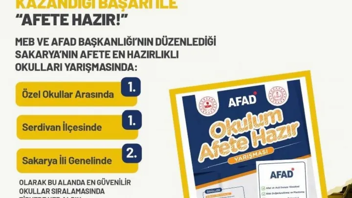 AFAD Başkanlığı ile Milli Eğitim Bakanlığı koordinasyonunda düzenlenen 'Okulum Afete Hazır' yarışması çerçevesinde Altınküre Okulları, özel okullar ve Serdivan ilçesinde birinci, Sakarya genelinde ise ikinci oldu.