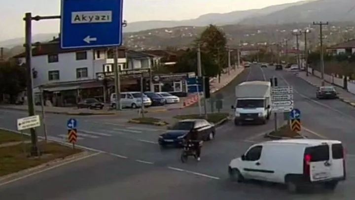 Kaza, dün Akyazı ilçesi D-140 kara yolu Kuzuluk Mahallesi kavşağında meydana gelmişti. Edinilen bilgiye göre, kırmızı ışıkta geçen M.C.Y. idaresindeki 54 FM 281 plakalı hafif ticari araç, Recep Kartal (33) kontrolündeki motosiklet ve Ö.Ö. idaresindeki 54 H 0741 plakalı otomobile çarpmıştı. Motosiklet sürücüsü olay yerinde hayatını kaybederken, araçlarda bulunan 4 kişi de yaralanmıştı. Kazanın görüntüleri ortaya çıktı. Görüntülerde, kırmızı ışık ihlali yaptığı görülen hafif ticari aracın, motosiklet ile otomobile çarptığı ve çarpışmanın etkisiyle motosiklet sürücüsünün metrelerce yükselerek yere savrulduğu anlar yer aldı.