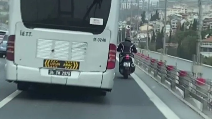 Şiddetli rüzgar nedeniyle 15 Temmuz Şehitler Köprüsü'nde ilerlemekte zorlanan motosiklet sürücüsüne, metrobüs siper oldu. O anlar vatandaşın cep telefonu kamerasına yansıdı.