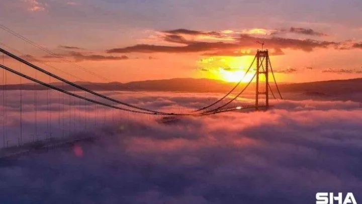 Çanakkale'de 2 gündür etkili olan yoğun sis nedeniyle deniz ve kara trafiği olumsuz etkileniyor. Gün doğumunda Drone Pilotu Cihan Kurnaz tarafından 1915 Çanakkale Köprüsü'nün sisler içerisindeki hali havadan görüntülendi. Kartpostallık görüntülerin oluştuğu videoda, 318 metre yükseklikteki köprü ayaklarının büyük bölümü sis bulutu altında kaldı.