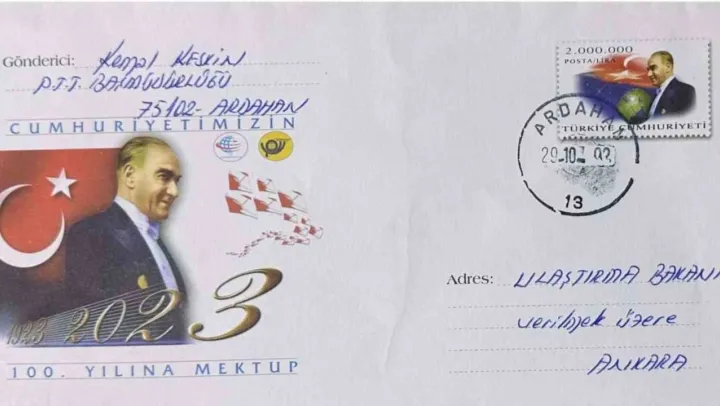İki çocuk babası olan PTT çalışanı Kemal Keskin, 21 yıl önce geleceğe bir anı bırakmak ve mektup kavramını toplumda canlı tutmak amacıyla PTT tarafından hayata geçirilen, '2023'e Cumhuriyetimizin 100'üncü Yılına Mektup Kampanyası' kapsamında Ulaştırma ve Altyapı Bakanlığı makamına mektup yazdı. Keskin, mektubunda, 'Sayın Ulaştırma Bakanıma; Türkiye Cumhuriyetimizin 100'üncü yılını kutlar, bundan sonraki yaşamınızda üstün başarılar ve sağlık dolu günler dilerim' ifadelerine yer verdi.