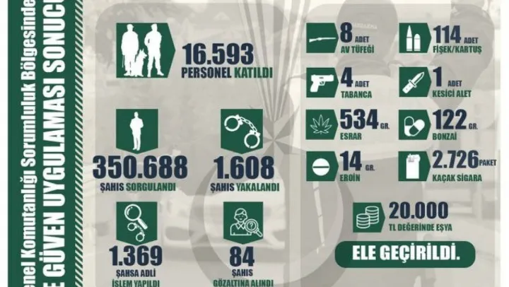 Jandarma Genel Komutanlığı sosyal medya hesabından yaptığı paylaşımla, kendi sorumluluk bölgelerinde gerçekleştirdiği huzur ve güven operasyonlarında yakalanan şahısları ve ele geçirilen maddeleri açıkladı. Paylaşılan bilgilere göre 16 bin 593 personelin katıldığı operasyonlarda, 350 bin 688 şahıs sorgulandığı, bin 608 şahısın ise yakalandığı ifade edildi. Yakalanan şahıslardan bin 369'una adli işlem yapılırken 84 şahısın ise göz altına alındığı bilgisi verildi.