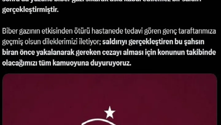 'Bursa'da henüz kimliği belirlenemeyen bir şahıs, 9 yaşındaki Trabzonspor Futbol Okulu mensubu öğrencimize önce hakaret edip sonra da yüzüne biber gazı sıkarak asla kabul edilemez bir saldırı gerçekleştirmiştir. Biber gazının etkisinden ötürü hastanede tedavi gören genç taraftarımıza geçmiş olsun dileklerimizi iletiyor; saldırıyı gerçekleştiren bu şahsın bir an önce yakalanarak gereken cezayı alması için konunun takibinde olacağımızı tüm kamuoyuna duyuruyoruz.'
