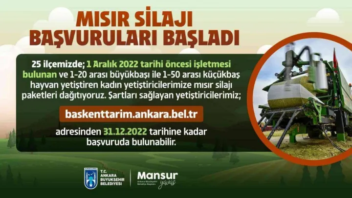 Ankara'nın 25 ilçesinde 1 aralık 2022 tarihi öncesinde işletmesi bulunan ve 1-20 arası büyükbaş ile 1-50 arası küçükbaş hayvanı bulunan kadın yetiştiricilere onar paket 500 kilogramlık silajlık mısır desteği verilecek.