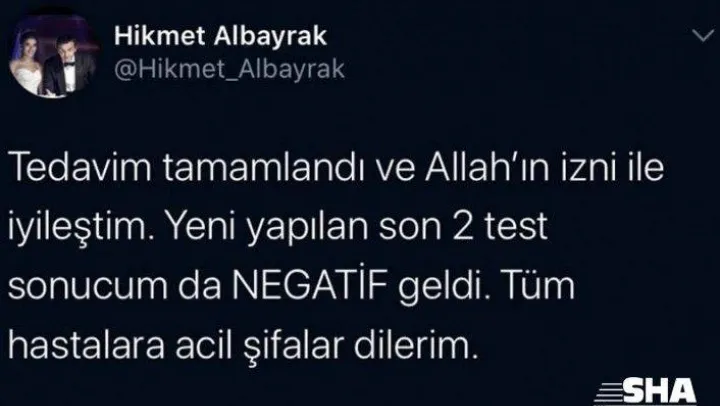 'Tedavim tamamlandı ve Allah'ın izni ile iyileştim. Yeni yapılan son 2 test sonucum da NEGATİF geldi. Tüm hastalara acil şifalar dilerim.'