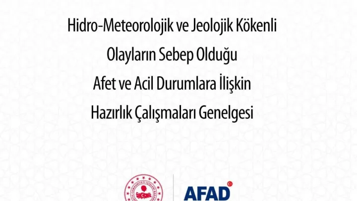 Afet ve Acil Durum Yönetimi Başkanlığı (AFAD) sosyal medya hesabından yaptığı paylaşımda 'Hidro-Meteorolojik ve Jeolojik Kökenli Olayların Sebep Olduğu Afet ve Acil Durumlara İlişkin Hazırlık Çalışmaları' konulu genelgenin yayımlandığını duyurdu.