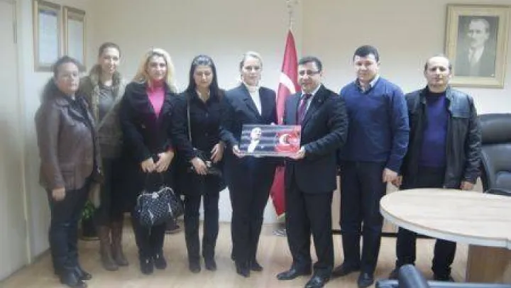 İlçe Başkanı Metin Karakaş ziyaretçilerini makamında ağırlarken kendisine İlçe Başkan Yardımcıları Aydın Karabina ve Alparslan Çalış'ta eşlik etti.