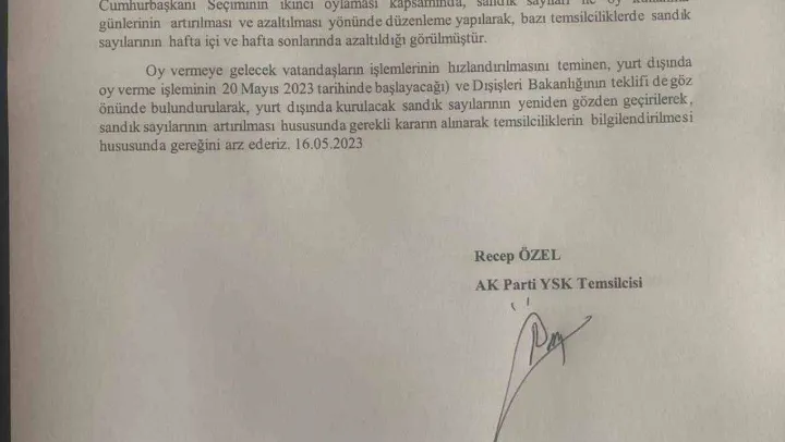Oy vermeye gelecek vatandaşların işlemlerinin hızlandırılmasını teminen, yurt dışında oy verme işleminin 20 Mayıs 2023 tarihinde başlayacağı ve Dışişleri Bakanlığının teklifi de göz önünde bulundurularak, yurtdışında kurulacak sandık sayılarının yeniden gözden geçirilerek, sandık sayılarının arttırılması hususunda gerekli kararın alınarak temsilciliklerin bilgilendirilmesi hususunda gereğini arz ederiz.'