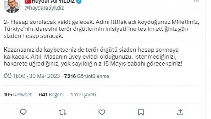 Meral Akşener'in altılı masanın üvey evladı olduğunu da sözlerine ekleyen Başkan Yıldız, 'Hesap sorulacak vakit gelecek. Adını ittifak adı koyduğunuz Milletimiz, Türkiye'nin idaresini terör örgütlerinin inisiyatifine teslim ettiğiniz gün sizden hesap soracak. Kazansanız da kaybetseniz de terör örgütü sizden hesap sormaya kalkacak. Altılı Masanın üvey evladı olduğunuzu, istenmediğinizi, hakarete uğradığınız, yok sayıldığınız 15 Mayıs sabahı göreceksiniz! O gün Altılı Masadaki hiçbir isim sizi savunmayacak, hakkınızı korumayacak ama biz sizi savunacağız. Şahsınız için değil, inandığımız değerler ayakta kalsın, terör örgütlerine yem yapılmasın diye savunacağız. İYİ Partili kardeşlerimiz her şeyin farkında. CHP'yi içine sindiremeyen CHP yönetiminin, HDP ile muhabbetinin farkında. Cumhuriyet'le, Milli Mücadelemizle, Gazi Mustafa Kemal Atatürk'le kavga edenlerin İYİ Parti'ye hangi gözle baktıklarının farkında' ifadelerini kullandı.