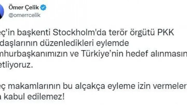 AK Parti Sözcüsü Ömer Çelik resmi sosyal hesabında yaptığı paylaşımda, İsveç'in başkenti Stockholm'da terör örgütü PKK yandaşlarının düzenledikleri eylemde Cumhurbaşkanı Erdoğan'ın ve Türkiye'nin hedef alınmasını lanetlediklerini bildirdi. İsveç makamlarının bu alçakça eyleme izin vermeleri asla kabul edilemez olduğunu ifade eden Çelik, açıklamasında şu ifadelere yer verdi: