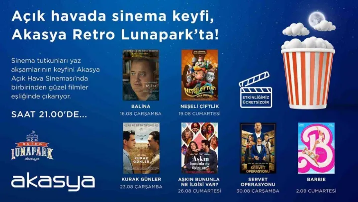 Akasya Açık Hava Sineması için geri sayım başladı. 16 Ağustos-2 Eylül tarihleri arasında her Çarşamba ve Cumartesi saat 21.00'de ücretsiz gerçekleşecek film gösterimleri ile sinemaseverler Akasya Retro Lunapark'ta ağırlanacak.