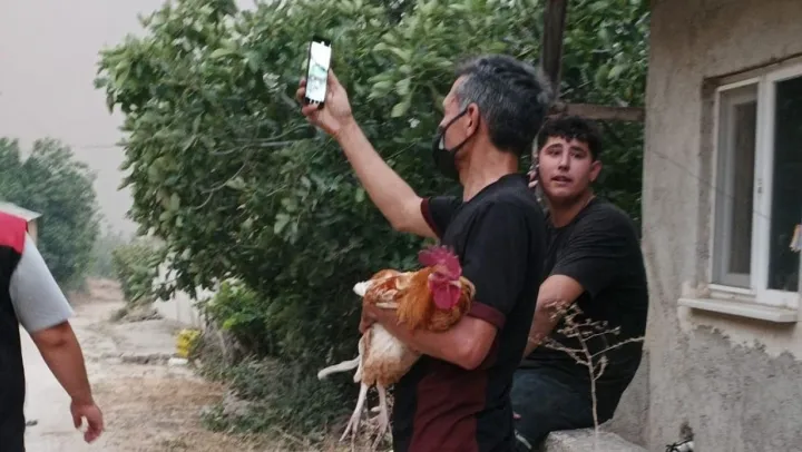 Alevlerin yaklaştığı köyde bir vatandaş horozunu kucağına alarak köyü terketti