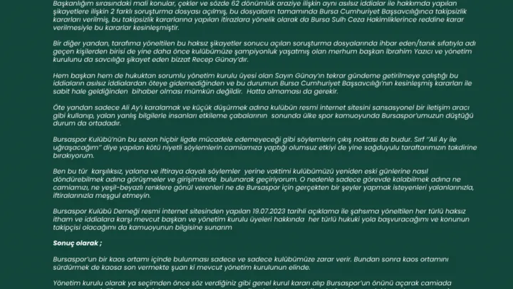 '19.07.2023 Çarşamba günü Bursaspor Kulübü Derneği resmi internet sitesi aracılığıyla Bursaspor Yönetim Kurulu tarafından yapılan açıklama ile şahsım hakkında asılsız ve haksız iddialar gündeme getirilmiştir. Öncelikle, böylesi mesnetsiz iddiaların, tam da Bursaspor Kulübü'nün yapılacak ilk genel kurulunda başka bir adayın çıkmaması halinde başkanlığa aday olacağımı açıklamış olmam akabinde gündeme getirilmiş olmasını kamuoyunun takdirine bırakmaktayım. Başkanlığım sırasındaki mali konular, çekler ve sözde 62 dönümlük araziye ilişkin aynı asılsız iddialar ile hakkımda yapılan şikayetlere ilişkin 2 farklı soruşturma dosyası açılmış, bu dosyaların tamamında Bursa Cumhuriyet Başsavcılığınca takipsizlik kararları verilmiş, bu takipsizlik kararlarına yapılan itirazlara yönelik olarak da Bursa Sulh Ceza Hakimliklerince reddine karar verilmesiyle bu kararlar kesinleşmiştir.
