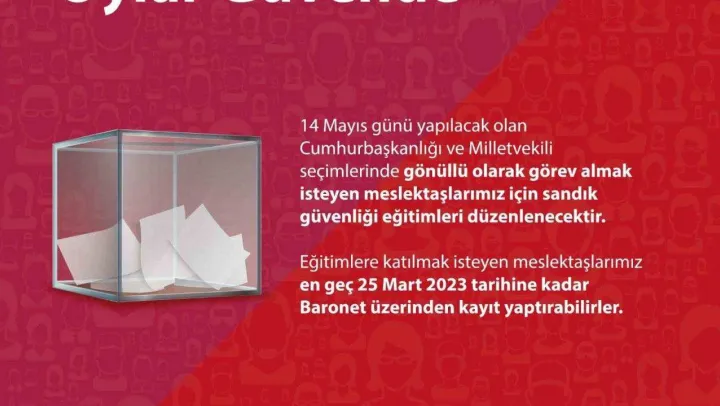 Ankara Barosu'nca, 14 Mayıs günü yapılacak olan cumhurbaşkanlığı ve milletvekili seçimlerinde gönüllü olarak görev almak isteyen avukatlar için sandık güvenliği eğitimleri düzenlenecek. Eğitimlere katılmak isteyen avukatların en geç 25 Mart 2023 tarihine kadar Baronet üzerinden kayıt yaptırabilecekleri Ankara Barosu tarafından duyuruldu.