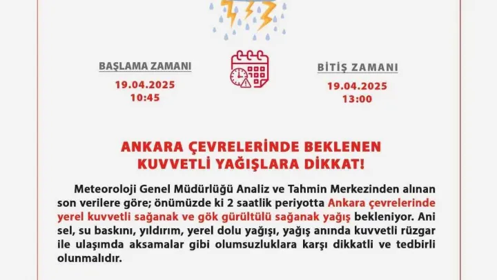Ankara Valiliği tarafından yapılan açıklamada, Ankara Bölge Tahmin ve Erken Uyarı Merkezi verilerine göre başkent çevresinde beklenen kuvvetli yağışlara karşı dikkatli olunması gerektiği belirtildi. Başkentlileri uyaran paylaşımda, 'Ani sel, su baskını, yıldırım, yerel dolu yağışı, yağış anında kuvvetli rüzgar ile ulaşımda aksamalar gibi olumsuzluklara karşı dikkatli ve tedbirli olunmalıdır' ifadelerine yer verildi.